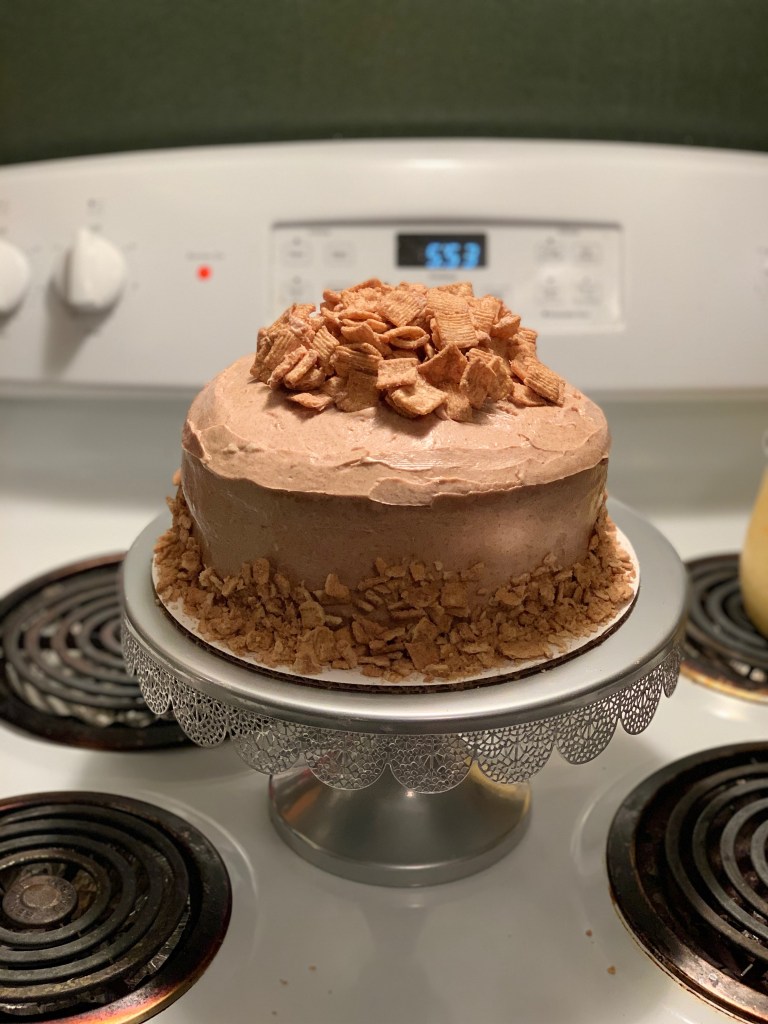 I have to say that this is one of the best cakes to make and eat! It’s a vanilla cinnamon cake with cinnamon cream cheese frosting filled cinnamon toast crunch cereal. If you have kids like my nephews, I’m sure this is something that they would absolutely love. It’s sweet, crunchy and chock full of cereal. I mean what’s not to love?!